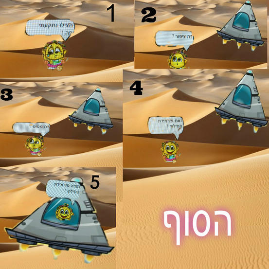 היי ! אז יש לי כמה הסברים - בגלל שלא נכנסתי למשחק ( כי זה מוביל אותי לביוב ) אז אני עיצבתי את עצמי נתקעת במדבר , בלי אוכל ומים . אם שמתם לב , יש כתמים על הכיתוב ועליי . זה החול המדברי . אם עשיתי קטן מדי כתוב שם : 1. " הצילו נתקעתי פה ! " 2." זה ציפור ? " 3. " זה מטוס ? " 4. " זאת פירמידת החילוץ ! " 5. תודה לפירמידת החילוץ !" מקווה שאהבתם