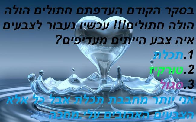 אני אישית אוהבת תכלת ולבן זה הצבעים שמשתלבים יפה ותעלת תמיד מרגיע אותי ולבן זה צבע הכי נקי ומאור בעולם וכולם משתמשים בלבן |