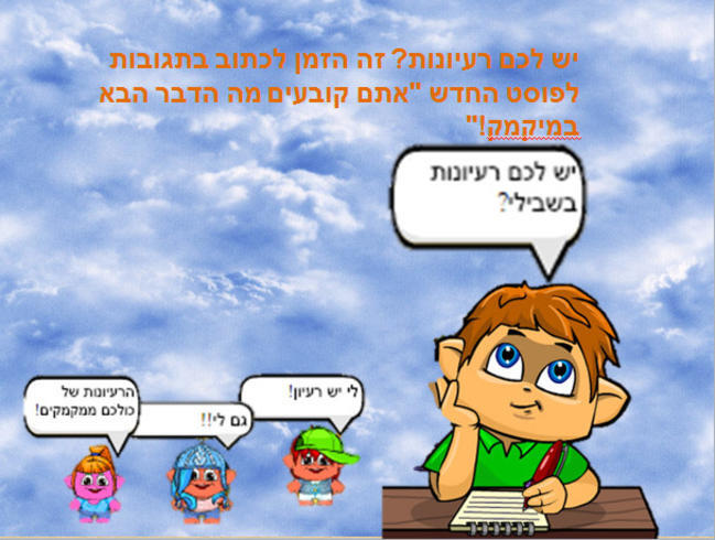 היי מיקמקים מה נשמע? אז היום לכבוד הפוסט החדש, החלטתי לעשות תמונה חדשה. אז אם יש לכם רעיונות לדבר חדש במיקמק, תוכלו לכתוב בתגובות לפוסט החדש בשם "אתם קובעים מה הדבר הבא במיקמק!" והתשובות הממקמקות ביותר יזכו במנוי לשלושה חודשים! כן כן. שמעתם נכון! בגלל זה כדי לחשוב טוב טוב ואני בטוח שיהיה לכם המון רעיונות מקוריים ויצירתיים! אז בהצלחה לכולם! המשך יום נעים :)