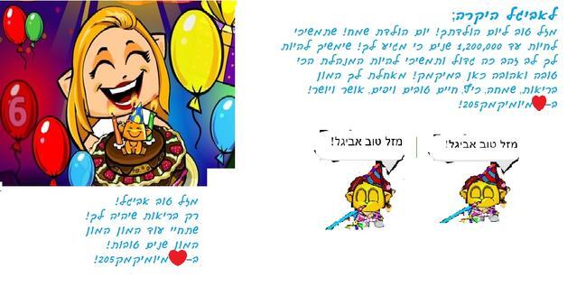 היי מיקמקימוס! אז...כפי שכולנו שמנו לב, מחר למנהלת האהובה שלנו, אביגל, יש יום הולדת! אז חשבתי לי למה לא להכין לה ברכה? אז הכנתי לה! כרגיל מה ביצירה: שתי מיקמקיות(אותה מיקמקית פעמיים)שאומרות "מזל טוב אביגל!", שתי ברכות לאביגל ותמונה שלה! אז מקווה לתמונת היום ושאהבתם! ביי מיקמקימוס!