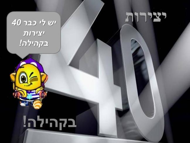 יש לי כבר 40 יצירות בקהילה! רק לפני 9 ימים העלתי את היצירה ה-30! לא מיקטורף?! כמו ביצירה ה-30- הגעתי למספר היצירות בעיקר בזכות פיצפוצוניק- אז תודה רבה לך! מאז שפתחת את התחרות,דירבנת אותי לשלוח עוד ועוד יצירות- ומ-18 יצירות הגעתי בכמה שבועות ל-40 יצירות! כמובן שזה גם לא היה קורה בלעדיכם- אתם גם דירבנתם אותי לשלוח עוד יצירות, בזכות כל הלייקים והתגובות ששלחתם לי- אז תודה רבה לכם! מקווה שאהבתם! שלכם, אנה1388:) נ.ב מיקמנייה אני יודעת שזו התמונה של המיקמק שלך,פשוט חיפשתי המון זמן מיקמק קורץ ומצאתי רק את התמונה שלך... מקווה שאת מבינה אותי:/ לא לשכוח לפרגן בלייק!:)