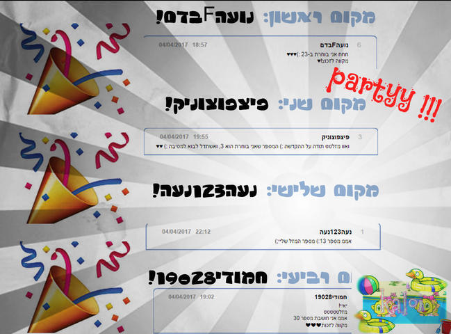 היי לכולם.. אז הזוכים בהגרלה הם......... ~~~~~~~~~~~~~~~~~~~~~~~~~~~~~ מקום 1: נועהFבדם!!! היא זוכה ב-לוגו קיצי+ציור חמשיר+סרטון איתי ליוטיוב... ~~~~~~~~~~~~~~~~~~~~~~~~~~~~~~~~ במקום השני והלא פחות מכובד זוכה......... מקום 2: פיצפוצוניק!!! היא זוכה ב-עיצוב+עיצוב חמשיר+לוגו קיצי+סרטון איתי ליוטיוב... ~~~~~~~~~~~~~~~~~~~~~~~~~~~ במקום השלישי............. זוכה..... מקום 3: נעה123נעה!!! והיא זוכה ב: לוגו קיצי+עיצוב חמשיר+סרטון איתי ליוטיוב+סלפי איתי ~~~~~~~~~~~~~~~~~~~~~~~~~~~ ואת המקום הרביעי והאחרון לוקחת....... מקום 3: חמודי19028!!! והיא זוכה ב: סרטון איתי ליוטיוב+לוגו קיצי+ציור רגיל בצייר ~~~~~~~~~~~~~~~~~~~~~ אז כן! אלו הזוכים! אז בשביל קבלת הפרס בבקשה לשלוח תמונה לקהילה ולהקדיש לי!