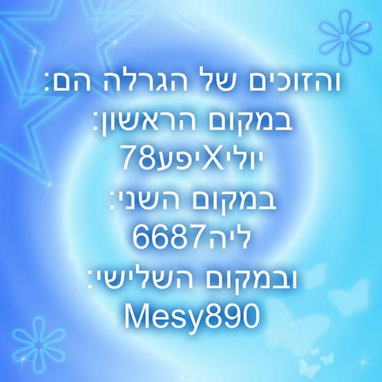 והזוכים של ההגרלה הם: מקום ראשון: יוליXיפע78 מקום שני: ליה6687 ובמקום השלישי: Mesy890 כל הכבוד לכולם! הפרסים: מקום ראשון: עיצוב שם+לוגו+4 עיצובים מקום שני: עיצוב שם/לוגו+3 עיצובים מקום שלישי: עיצוב שם/לוגו/עיצוב ♥♥♥♥♥ הודעות: ~הזוכים צריכים לשלוח לי תמונה שלהם ולהקדיש לי. ליה וMesy אתם צריכים לבחור בפרסים מבין האפשרויות שיש לכם. (האפשרויות הם רק אם יש סלש /) או לתאם מתי להיפגש ~מי שלא זכה לא נורא יהיה עוד הגרלות ~בקרוב יהיה בקהילה תחרות סופר שווה שלי ושל יוליXיפע78 ♥ יומטוב