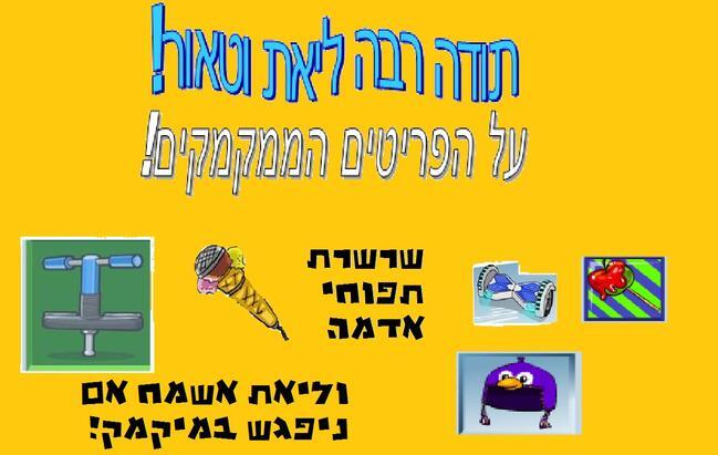 תודה רבה רבה לליאת ולטאור על הפריטים הממקמקים בתחרות הציורים אפילו שלא זכיתי מבין הראשונים :) אבל למרות שלא זכיתי חשוב לדעת שמאוד רציתי לזכות בשדרוג מיק-יאמי כי כמו שאתם יודעים אני כל הזמן זוכה בתחרויות של מנויים של שבועים או שבוע ואני ישמח קצת להתמקמק בשדרוגים :) אבל לא נורא יש את פעם הבאה :) ויכול להיות גם שאני יזכה במיקשימה החודשית כי העלתי ציור :) שאלה לליאת: היי ליאת, אני רוצה שתבקרי בחופש הרבה כי מזמן לא ראיתי אותך וששאלתי בצור קשר אמרו לי שאת לא נמצאת כמה ימים. אז מקווה שחזרת ושתבואי הרבה לבקר אותנו :)) אני רוצה גם לדבר איתך בקשר לאמא שלי ולהגיד לך הכל ובקשר לדרגת 10 שקנו לי! אז תודה רבה שוב לליאת וטאור על הפריטים הממקמקים! המשך שבוע ממקמק בפנטזיה לכולם!