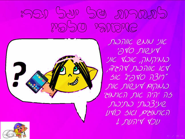 ~~~~~~~~~~~ סלפי לתחרות של יעל וברבור♥♥♥ אז אני תמיד שואלת "רוצה סלפי?" וזה כבר ישן.. אז החלטתי להמציא משהו הרבה, הרבה יותר חדשני! אימוגי סלפי! אז זה בעצם אימוגי של סלפי שלידו יש סימן שאלה וזה אומר כאילו"רוצה סלפי?"