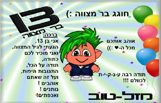 מאחל לך שיהיה לך המון כיף בבר מצווה שלך ושתמיד תהיה בריא ומאושר :) |