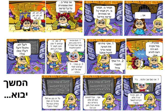 הנה הוא:) תקציר: אנה מגיעה לפורים (כמו שהבטחתי) ודוחפת את אסתר כדי שאיך שלא קוראים לו (שכחתי את השם) יבחר בה. נראה לי שהיא קצת עיצבנה את אסתר... (אם יש לי טעויות כתב בתיאור כאן אז סליחה פשוט המקלדת קצת מקולקלת לי) הוא מבקש ממנה להתנשק והיא נותנת לו אגרוף והוא מתעלף. אנה פוגשת ליצן בשם לופדי שמבטיח לה שהוא יעזור לה להפוך את הזמן של פורים לטוב. לופדי ברח והוא אשאיר מחשב לשיחה קצרה. אנה מגלה את הסיסמה ולא יודעת אם היא נכונה או לא. מה יקרה אם הסיסמה תהיה נכונה? האם היא בכלל נכונה? כל זה תגלו בפרק הבא של מצילי הזמן! (הקדשתי ליעל כי סיפרתי לה על הקומיקס והיא ביקשה הקדשות לפרקים)