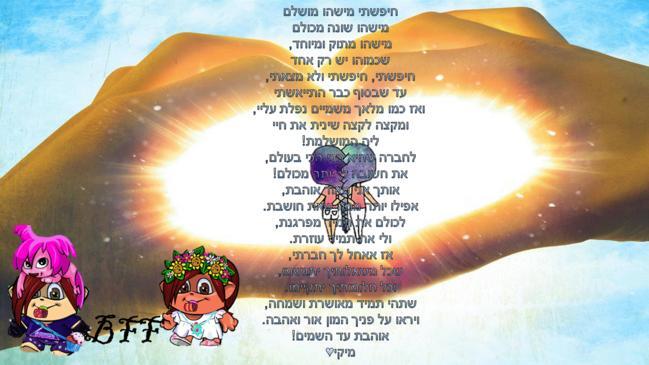 ואווו!!! איזו ברכה מושלמת!! המילים כל כך אמיתיות, יצא לך נדיר!! את סופר כשרונית-ואת זוכה על בטוח!!! |
