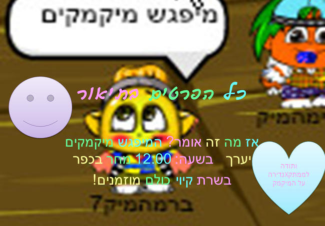 אז היוש מיקמקים! שמעתם על מיפגש מיקמקים? אז זהו זה אני עושה אחד כזה בכל חודש\שבוע תפרגנו בלייק והנה הפרטים: זה יתקיים מחר בשעה 12:00 בכפר בשרת קיוי ביוש מקווה שתבואו