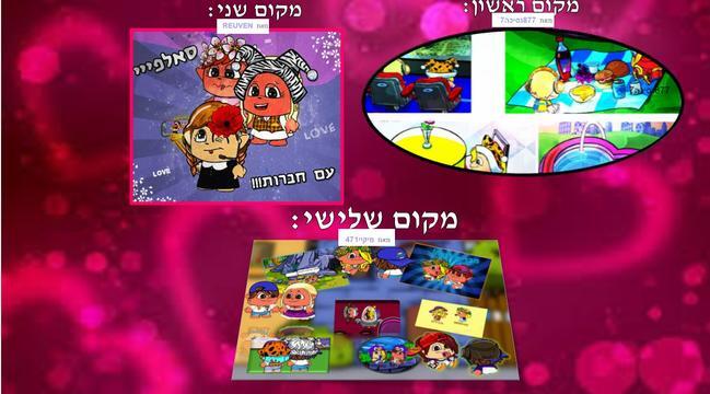 היי אני יודע שחשבתם שייקח עוד זמן לחשיפת הזוכים אבל 4 מיקמקים מוכשרים במיוחד העלו יצירות מהממות ולא יכולתי להתאפק להעניק להם את הפרסים המגיעים להם! עכשיו הזוכים... 10,9,8,7,6,5,4,3,2,1... מקום ראשון: 877נסיכה7 מקום שני: REUVEN מקום שלישי: מיקיי471 מקום ראשון זוכה ב... באנר, 2 ציורים וציור עם חבר/ה! מקום שני זוכה ב... עיצוב, 2 ציורים וציור עם חבר/ה! מקום שלישי זוכה ב... עיצוב, ציור 1 וציור עם חבר/ה! תודה ל- יהלול12345 שהשתתף בתחרות וסליחה שלא זכית:(