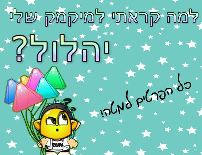 אז למה קראתי לעצמי יהלול12345? ~~~~~~~~~~~~~~~~~~~~~~~~~ כשרציתי להירשם למיקמק לא ידעתי איזה שם לבחור, בתקופה הזאת מאוד אהבתי את השם יהל (אור). החלטתי לבחור שם שכולל את המילה יהל וגם שיהיה שם קליט כמובן;) אחרי קצת זמן חשבתי על המילה יהלול (עם חולם!) והוספתי לה גם מספרים פשוטים: 12345. כך השתמשתי בשם הזה לפני תקופת ההפסקה שלי מהקהילה. בזמן שהייתי בתקופת הפסקה מהעלאת יצירות לקהילה יצא לי לחשוב על שם שישמע יותר מגניב למיקמק שלי וכותבים אותו באותה צורה בדיוק: יהלול עם שורוק. הכוונה לחבר את המילים יהל וLOL. ומאז אני מסיים בחלק מהיצירות שלי בסיומת הזאת: יהלLOL אבל מהיום אני מצדיע לעבר ואני רוצה להישאר עם שם מקורי. אז שלכם, ~יהלול~