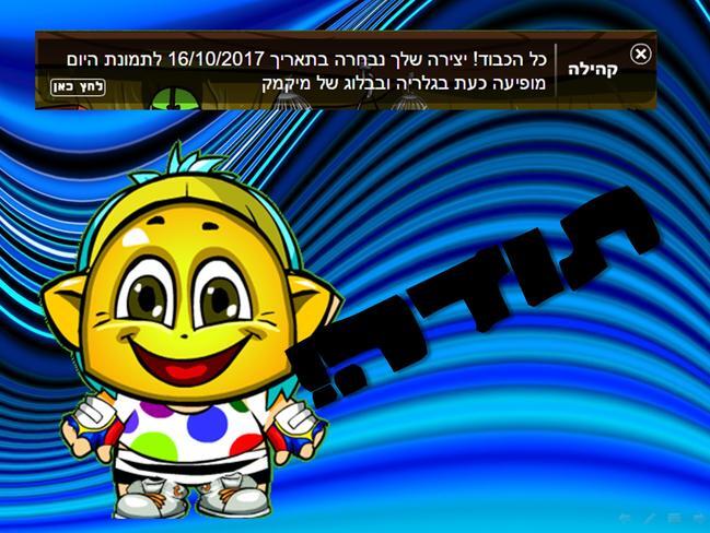 הייייי אז רציתי להגיד תודה לצוות מיקמק ששמו אותי בתמונת היום השישית שליD: כמובן גם עם טיחוש123 ונועה8617 :-) במקרה גם יצא שאתמול חבר ממש טוב שלי (המעופניקים) עשה לי עיצוב וזה היה תמונת היום ;) וגם לפני כמה ימים הייתי אז זה די צירוף מקרים :)) בכל מקרה די התפלאתי שהיצירה הזאת היא תמונת היום כי הכנתי אותה רק כמה דקות ;)