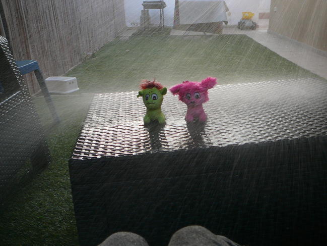 אלביס ופנסי יצאו החוצה לשחק בכדור הגומי האדום של אלביס ולפתע התחיל גשם ואלביס ופנסי נרטבו עד היסוד ולא ידעו מה לעשות ואז צץ במוחו של פנסי רעיון שהם ימשיכו לשחק בגשם וככה היה