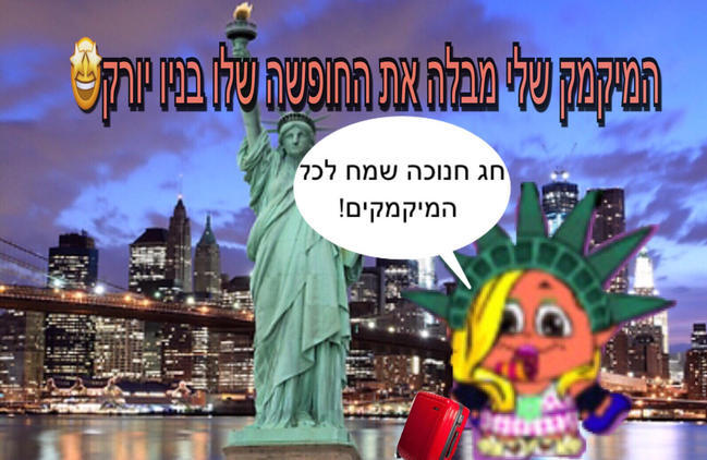היי מיקמק , פעם ראשונה שאני משתתפת בתחרות החודש וממש השקקעתי ביצירה! המיקמק שלי נהנה בניו יורק ! מאוד מקווה לזכות ותמסרו בהצלחה לכל מי שהתאמץ והשקיע וכמובן חג חנוכה שמח!!!!, אוהבת :) !.