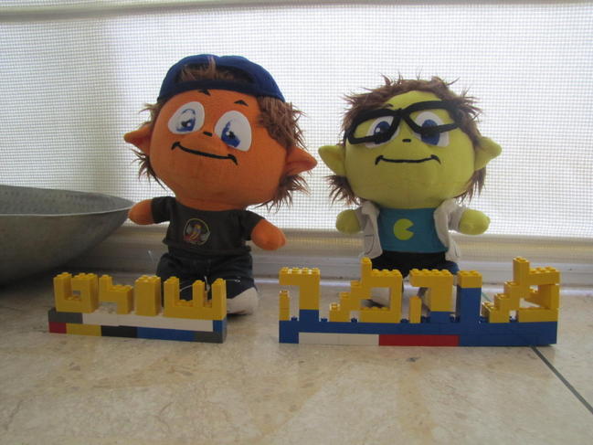 סאני ומקס עם מבנה לגו שבניתי שכתוב עליו: "מיקמק שולט"