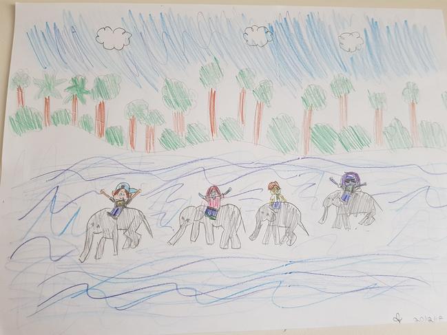 ציירתי את מקס , זואי , ג'ימבו וסאני על פילים שעל מים ומאחוריהם יש יער ירוק ושמיים בעירים בתאילנד .