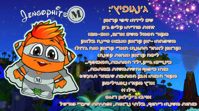 אז היי:) היי פטריק ופופיXD אז ככה, למה שלא אשתתף בתחרות שלכם? אני מאוד מעריך את כוכבהXD אוקע חפרתיXD אמממ מי אני? אוקע, אז ככה, לדמות שלי קוראים ג'נגופיץ נתחיל בלמה? ג'נגה + פיצ אין לי מושג מה זה ג'נגה אבל זה היה נשמע לי סופר מגניב וחמודXD חח והוספתי פיצ כמובן (אני חתיך) סתם סתם.. אוקע, ג'נגו פיץ הוא נער צעיר, ובעצם בואו ותגלו את כל הפרטים עליו:
