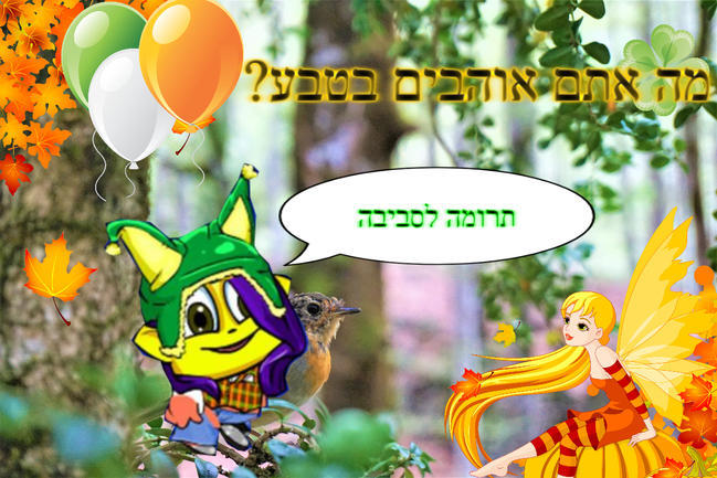 היי פאנים! ביצירה זו אשמח לדבר על משהו שכנראה המון ילדים מתעלמים ממנו - הסביבה שלהם! אנחנו נמצאים בתוך מרחב אשר אנחנו בכלל לא מכבדים, להפך אנחנו הורסים אותו! אני חושבת שאנחנו צריכים לשנות את זה! ולכן היום אפתח בתחרות! כל מי שרוצה להשתתף יצתרך לעשות יצירה ובה יכתוב מה הוא אוהב בסביבה שלו ואיך הוא יכול לשנות אותה לטובה! אני אשמח עם תשתתפו! זה מאוד חשוב! אנחנו צריכים להודות לסביבתנו ולפעול לטובתה! מקווה שתשתתפו! ~love you~ סופרפאן1