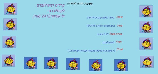 נ.ב העלתי את זה שוב כי יצירה קודמת עשיתי בצבע בהיר יותר ועכשיו תיקנתי...אם לא רואים עדיין הנה הפרטים: יום-חמישי שעה-8:30 בערב איפה-כפר ומשם לדיסקו