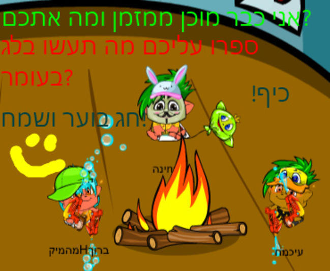 טוב חח אני יותר מידי מתרגש רואים ששלחתי הרבה דברים LOL כן חח אז שחכתי להגיד לכם באיזשהו ציור ניראלי מה אני יעשה בלג בעומר 1.אדליק מדורה עם אבא שלי 2.אצייר ציורים של המדורה ואתלה בדלת 3.אקשט את ביתי במיקמק מוכן! 4.אשים שירים לכבוד לג בעומר 5.אקנה מלאאאא ארטיקים שלא אתחמם 6.לעולם לא לשכוח כובע ומים! 7.אעשה בערוצי פסטיבל לג בעומר! 8.קיצור יהיה כיף!
