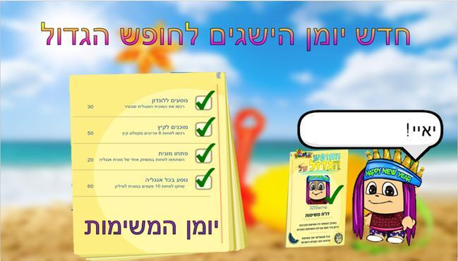 יש יומן משימות חדש לחופש! עם משימות שתוכלו לקבל דרכן הישגים(: ובכך להתקדם בדרגות!!! בהצלחה!!!