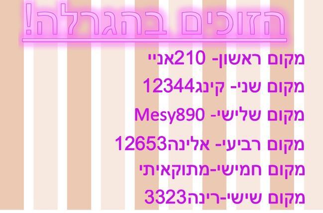 אז אלו הזוכים בהגרלה! את הפרסים אתחיל להכין היום או מחר! אני מתחילה בסדר: אני מכינה קודם את של המקום הראשון לאחרון!אז אלו שלקראת הסוף לא לדאוג! לא שכחתי אתכם!