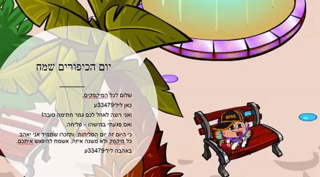 שלום מיקמקים!! היום יום כיפור, והחלטטתי לאחל לכם כמה איחולים. צםו בתמונה ותראו את האיחולים, הכנתי את האיחולים במיוחד בשבילכם במלא מלא אהבה שתקראו. כי בשבילי זה ממלא שמחה, אברך אתכם עכשיו בברכה טובה: יום כיפור הגיע, בואו לרכב באופניים, נחגוג ביחד בשמחה, בכוח כפות הרגליים. בואו נמקמק במיקמק, נשחק משחקים כיפיים, כי לכבוד יום כיפור - נהיה אוהבים.