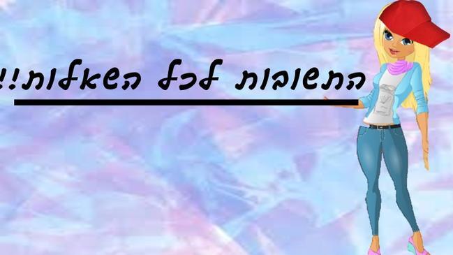 מלנר2070 1.מה המשחק האהוב עליך? 2.ציפס, פיצה או עוגת שוקולד? 3.מאיפה הכרת את מיקמק? 4.איך את מעצבת? 5.יש לך חית מחמד? אם כן איזו? 6.פרי אהוב? 7.זמר/להקה אהוב/ה 8.שלושה דברים שהיית לוקחת לאי בודד? 9.את עושה עיצובים? אם כן אז אפשר עיצוב בבקשה? 10.את יכולה להסתכל בקהילה שלי? 11.מכירה את העולם הוירטואלי טרופי? אם כן איך קוראים לטרופ שלך?