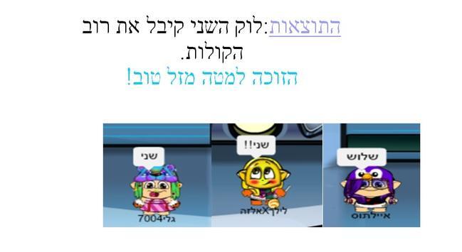 תוצאות מזל טוב לסגולי6061 כול הכבוד! על הסטייל כנראה שיש לך סטייל ממקמק כול הכבוד סגולי תפגשי אותי מחר בשעה אחת בקוקוס כפר עם את לא יכולה תכתבי לי בתגובות כדי שיוכל להיפגש איתך בשביל התמונה והעיצוב תודה למשתתפים זה רגש אותי בטרוף!! בגלל שהיה תוצאות כול כך מהר אז ממש בקרוב יעלה לוק השבוע שוב! אז תתכוננו! כי הפעם הוא היה קשה מאוד! והכי מושלם שיש! ושוב מזכירה הפרסים הם: תמונה איתי לקהילה ועיצוב לקהילה אז שווה להישתתף מזכירה עם עדין לא שאלתם אותי שאלות תשאלו אותי כמה שיותר בדף של השאלות והתשובות בקהילה שלי כי בקרוב עונה(: ביי ציטוסים! נתראה ביצירה הבאה תמיד שלכם מהממת ואוהבת! (סליחה שאני בתגובות כותבת לא את השם המלא שלי פשוט אני קצת פוחדת על משהו)