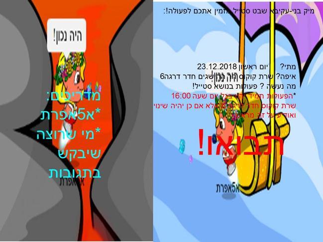 פעולה הבאה:1.13.2018 שעה 16:00 מקום שרת קוקוס חנות הריקודים קומה2 |