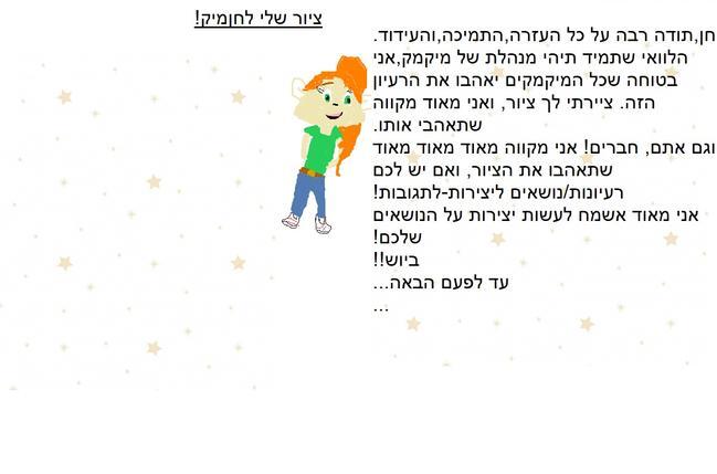 היי חברס! אין לי כל כך מה לכתוב כאן,כי הכל(כמעט) כתוב ביצירה עצמה.. טוב אני רק אגיד כמה דברים: 1.אל תתיחסו לזה שכתבתי "ציור מושלם"בכותרת... כתבתי את זה רק בשביל ליצור משחק מילים!(ציור *מושלם* לחןמיק ה*מושלמת*.לא התכוונתי שזה ידגיש לי,הכוכביות.פשוט רציתי שישימו לב לזה...) 2.יצא לי קצת עקום, אל תתיחסו לזה. ביוששששששששששששששש!!!!!!!!!!!!
