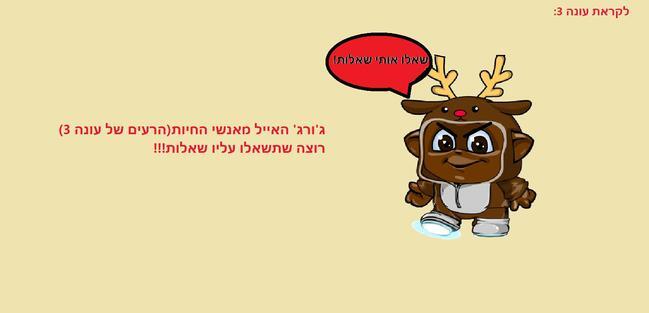 שלום לכולם!!!! כפי שכנראה ראיתם עלה פרק סיום העונה של סוף העולם עונה 2!!! ובסוף אפשר לראות שיש אנשים שמחופשים לחיות ובעצם הם חבורה(בקרוב יעלה עליהם פוסט!!) אז כאן בתמונה למעלה אנחנו רואים מישהו מהחוברה ששמו ג'ורג' האייל!! והוא מבקש שתשאלו אותו שאלות עליו כל שאלה! וגם שאלות על החבורה... +מחכה לשאלות!! תנו לייק תגובה\ביי!!!!!!!!!!
