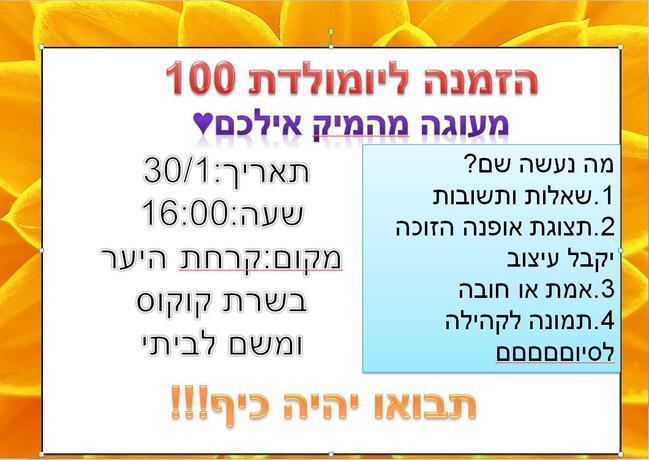 היושיםםם אז היום נכנסתי למיקמק וגיליתי שאני בת 100 ימים! אני הכנתי מסיבה עעעענקית כפול 100 כל הפרטים למעלה אגב עברו 100 ימים,הגיע הזמן שתכירו אותי קצת... תשאלו אותי שאלות ואענה לכולם ביצירה נפרדת (תוכלו גם לשאול במסיבה) פעם עשיתי שאלות ותשובות ורק כוכבית775 ענתה... אני מקווה שיהיו הפעם יותר שאלות... ביושים!!!