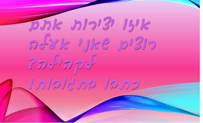 היי חברים! ממצב? אז רציתי לשאול אתכם שאלה. השאלה שרציתי לשאול אתכם היא: איזו יצירות באלכם שאני אעלה לקהילה? כתבו למטה, במקום שנקרא תגובות חיחי:) כל מי שיכתוב- לפי שיקולי אני אחליט אם לעשות על זה יצירה או לא..:) סואו... ביוששש נתראה ביצירה הבאהה!!! ❤❤❤❤❤❤❤❤❤❤❤❤