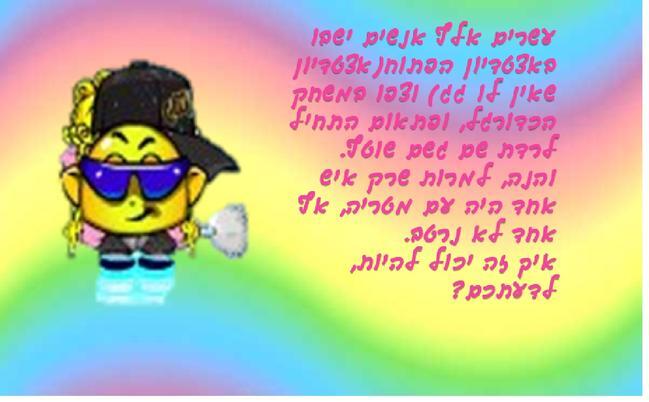 היי חברים! מה קורה? אזז... נתתי לכם את החידה השבועית!! הצלחתם לפתור אותה? רדו לתגובות, כתבו: 'אם אזכה אשמח לרקע...' ותפרטו על הרקע. תהיו מעודכנים בשאר היצירות שלי שיעלו אחרי זה, כי יכול להיות שאני אכתוב שם(בתיאור)דברים לזוכה. ולברבית1211-אני רוצה להגיד לך משהו שאמרתי לך גם בשאר היצירות הקודמות שלי, אבל כנראה לא היית מעודכנת... בכל מקרה, רציתי לומר לך שאשמח שתפרטי על הרקע שבחרת בתגובות, ואיך יוצרים אותו ו/או משיגים אותו וכל אלה... אה, וגם רציתי לפנות לכלל מי שכותב את התשובה הנכונה *אחרי* שאמרתי מי הזוכה, ובבקשה לא להעתיק כי מה יוצא לכם מזה? בסוף ממילא יש זוכה אחד, והוא זה שכתב את התגובה ראשון, אז ממילא מי שכותב שני אותה תגובה- הוא ממילא לא יזכה... אה, ושוב לברבית1211- כתבתי תגובה על מה שאני עומדת לומר עכשיו, אבל את יודעת איך זה, תגובות לא תמיד מתפרסמות(חיחי)... אזזזז אני אומר את זה גם עכשיו!! כתבת לי תגובה על זה שבאלך סוג יצירה- ציור. ואני... אני התכוונתי בכלל לסוגים שלי! סוג א', וסוג ב' חיחי!!:):):):) בכל מקרה, אשמח שתרשמי בתגובות איזה סוג חיחי... מקווה שאהבתם... אם יש לכם רעיונות/נושאים ליצירות- קדימה לתגובות!(אעעעעעעעעעעעעעע חרוז!) אני מאודדדדד אשמח לעשות יצירות על הנושאים שלכם! תאמת... אפחד בינתיים לא כתב לי בתגובות נושאים ליצירות... אז אני מקווה שאחד/אחת מכם יהיו הראשונים! יאלה!!! מחכה לרעיונות שלכם! ביושששששש!!!!!!! ❤❤❤❤❤