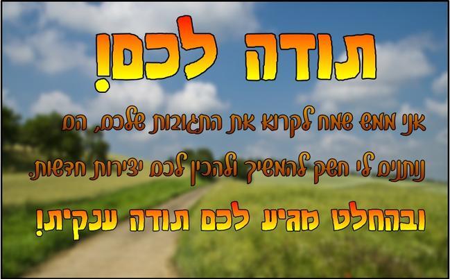 כל תגובה לא באה סתם תחשוב למה אנחנו אוהבים את הקהילה שלך:) דבר ראשון: הקהילה שלך מלאה ביצירות מושלמות שוראים בהן את הכישרון דבר שני: אתה מאוד נחמד |