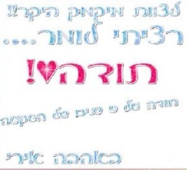 היי! אז אממ מאיפה להתחיל? אה כן! אז זה מוקדש לכם צוות מיקמק! רק רציתי לומר תודה! לפני שאתחיל להודות פה אני רוצה לספר משהו ;)) אני היום ראיתי את כל הבלוגים של מה חדש (של פעם) ראיתי פשוט עברתי אחד אחד מהמספר 1 עד למספר: 160 ומשהו! ואז.. אני לא יודעת למה זה פשוט גרם לי לגעגועים רבים אל המנהלים שהכרתי (המיקמק שלי דיי צעיר יחסית אבל יש לי מיקמק שהוקם 4 3 שנים אחרי שמיקמק הוקם!!) אני זוכרת איך היה כמו משהו כזה שהיה אפשר לזכות בכרטיסים לסרט המסע לכוכב המינימיקים! ובאמת יש לי על מה לומר לכם תודה! אני מכירה כמה מנהלים דיי ישנים;)) שרק מי שהיה פעם יוכל להכיר אותם כאילו ממש לפני שעזבו ולא בגלל שיש לו איזה פריט שלהם! ממש להכיר אותם בקטע שהיתי בתקופתם! אז באמת תודה! הגיע הזמן להודות: תודה: על מלא משימות מענינות תודה: על סקרים יפים ומסקרנים תודה: על סדרה נפלאה! תודה: על דמויות משעשעות! תודה: על שידרוגים מענינים תודה: על מנהלים נחמדים! תודה: על דרגות שמתחדשות מפעם לפעם תודה: על שרת מנהלים (למרות שאני לא בדרגה הזאתXD) תודה: על משחקים מחכימים ותודה: על עולם המיקמק!! אז זהו חברים זה הכל מקווה שנהנתם! ומנהלים זה מוקדש לכם! ביוש!!