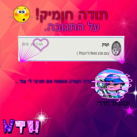 רציתי להגיד תודה לחןמיק על התגובה אני ממש שמחתי וגם תודה למנהלי מיקמק אני יעשה לכם יצירה בניפרד על הכל....