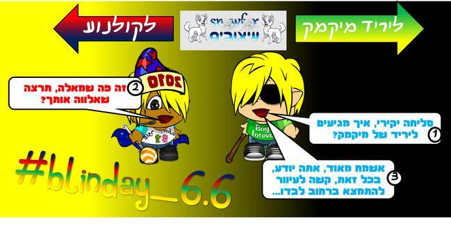 אני יודע שלא אזכה במיקשימה כי זה פחות מושקע אבל אני נהניתי להכין את היצירה ככה שלא משנה לי... אני מקווה שגם אתם תהנו להסתכל עליה! תודה מיוחדת מאוד לניסויHשלי!! מקווה ש❤ (אופס ניסוי...) ממני, snowfox1 ~~~~~~~~~~~~~~~~~~~~~~~~~~~~~~~~~~~~~~ עוד עובדה ששמתי לב אליה: אני לא יודע אם זה בכוונה, התאריך של ה"blinday", ה6.6, כתוב באותה צורה כמו השם לראייה של אדם שרואה מצויין, 6.6 (שש-שש)... אני לא יודע אם זה בכוונה אבל זה די אירוני (קארמה של הגורל) שבתאריך הזה חוגגים את יום העיוור XD...