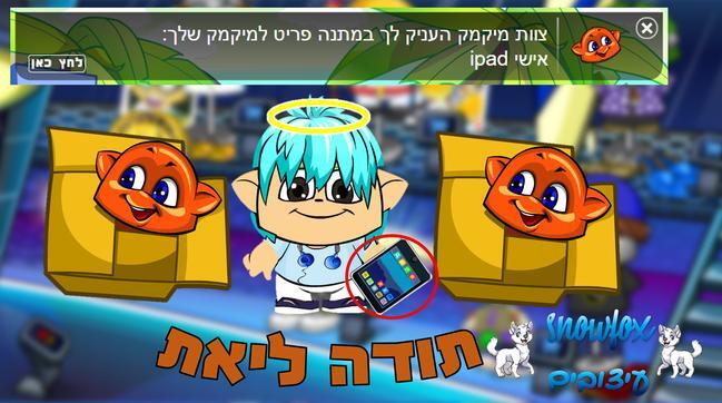 היי שועלים! אתמול ראיתי את היצירה החדשה של ליאת, שבה היא מחלקת לנו פריטים לבחירתנו במתנה, ומאוד התלהבתי! אומנם לא היה לי נעים לבקש, אבל החלטתי שאם כבר, אז כבר, וביקשתי אייפד אישי!! היום בבוקר נכנסתי למיקמק, וראיתי הודעה שבה כתוב שצוות מיקמק העניק לי את האייפד במתנה! נכנסתי לפריטים וגיליתי שזה באמת נכון!! האייפד היה שם! אני ממש אוהב את האייפד, הוא כזה מגניב! בכל מקרה החלטתי שאני חייב להכין יצירת תודה לליאת המקסימה, שנתנה לי את האייפד, ובכלל, על כל מה שהיא עושה בשבילנו ביום-יום! תודה ליאת, זה ממש עשה לי את היום! אני מעריך את כל המאמצים שאת עושה בשביל שמיקמק יהיה האתר הכי שווה באינטרנט! הצלחת עם זה :) וגם שאת פוגשת אותנו לפעמים, איזה כיף לראות אותך!! שוב, תודה רבה-רבה!!!!