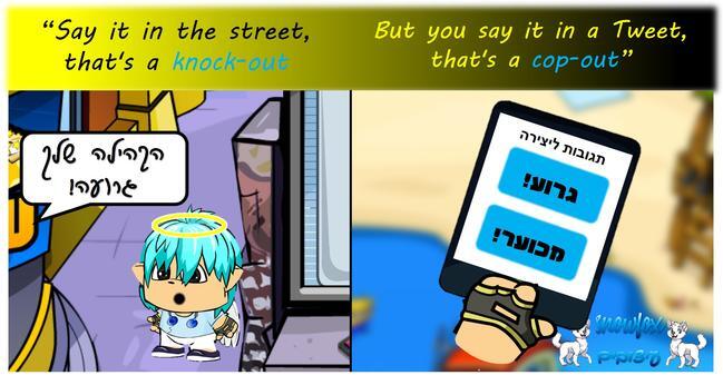 היי שועלים, אז לפני כמה זמן אני שמעתי שיר שהיה בו משפט שממש אהבתי: "Say it in the street, that's a knock-out, but you say it in a Tweet, that's "a cop-out המשפט בעצם אומר בעברית: "להגיד את זה ברחוב, זה נוק-אאוט (מכת מחץ), אבל להגיד את זה במחשב זאת התחמקות" בעצם המשפט מתכוון לכך, שלדבר פנים מול פנים (דברים רעים כן) זה בעצם יותר מסוכן, אבל לדבר במחשב זה התחמקות! למשל אם מישהו יבוא אלי ברחוב (לא במיקמק) ויגיד לי שהקהילה שלי גרועה, יכול להיות שאני אפגע ואעלב מזה, אבל לפחות המישהו הזה יהיה "גבר" ויגיד לי בפנים, אבל אם יכתבו לי בתגובות לקהילה או יגידו לי את זה במיקמק, זה כבר נחשב להיות "גיבור-מקלדת", וזאת התחמקות לכל דבר. אני מכאן בעצם פונה לכל מיקמק: אל תקללו ואל תפגעו במיקמקים אחרים. אנחנו לא יודעים מי אתם מאחורי המסך, וזאת לא חוכמה ללחוץ על כמה אותיות ולשלוח. מהכמה אותיות האלה אנשים נפגעים, אולי הם לא מראים כי זה רק מחשב, אבל מאחורי המסך אולי הם בוכים ועצובים. תחשבו טוב-טוב לפני שאתם פותחים את הפה (או את המקלדת), ותזכרו שזה בדיוק אותו דבר כמו להגיד את זה באמיתי, רק שפה אתה מתחמק, וזה אפילו יותר חמור! אחד הדברים שאני עושה כדי למנוע דברים כאלה, זה ללכת לעירייה. אני ועוגה (מהמיק) כל יום הולכים לשם ויושבים שם, זה המקום שבו יש הכי הרבה פגיעות, בעיקר על נושא פריטים ונדירים. אנחנו יושבים שם ואם מישהו פוגע או מעליב, אנחנו מיד נחלצים לעזרתו של מי שנעלב ומגנים עליו. אז אני מבקש ממכם שוב לדבר יפה ובשפה נעימה לחברים במיקמק, ולא "להתחמק" ולהגיד מילים לא יפות! אז אני מקווה שגם היצירה העבירה את המסר ואני אשמח אם תשתפו אותה כדי להעלות את המודעות לנושא הזה, וחשוב מכל: תפנימו את המסר שלה!