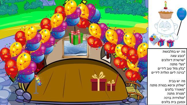 מה יש בבית *שולחן וכיסא בצורת מתנה *מאוורר בלונים *מנורת מתנה *וטלוויזית ברכה וכמובן בית בלונים