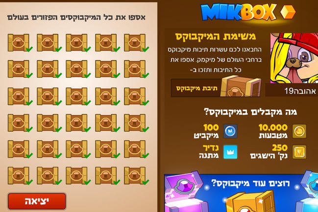 וואו!!!!!!!!!!!! אני לא מאמינה שסיימתי את המשימה! זה היה ממש קשה אבל זה שווה! מה בעצם קיבלתי מהמשימה? קיבלתי את חבילת אקסטרה שמכילה: 10,000 מטבעות מיקמק 100 מטבעות מיקביט פריט נדיר בהפתעה ו... 250 נקודות הישגים! וואו ממש שווה!!!!!!!!!!!!!!!!!!! אני ממש נהנית מהחבילת אקסטרה ועם מישהו יצטרך עזרה בלמצוא אני נמצאת בעיריה בשרת קיווי בשעות הצהריים או שתחפשו אותי במיקטוק אז תודה על המשימה הכיפית!
