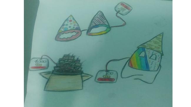 אוקיי אז עשיתי שלושה פריטים, חלק ברורים וחלק לא. הראשון, הזה עם המשקפיים המוזרות והצבעוניות - אלה משקפיים מוזרות וצבעוניות (על כל מסגרת של משקף כובע יום הולדת כזה).