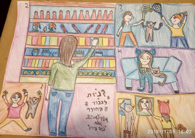 אז כן, זה סוג של קומיקס, רק בלי מילים:) בתבנית הראשונה ניתן לראות אותי ואת החתול שלי מחזיקים מאני מזומני:) בתבנית השניה, אני קונה כל מיני דברים (ספרים, כדורי טניס, עפרונות, חפצי וינטאג'..) בתבנית השלישית ואילך אני משתמשת בדברים שקניתי, כי מה הטעם לא להשתמש בהם?!