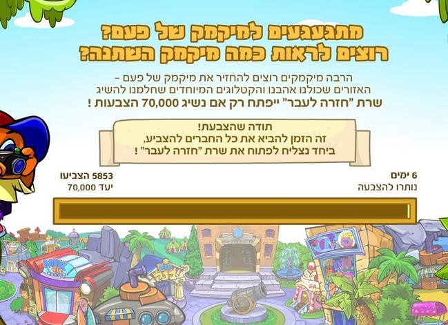 שלום חברים. בעוד שבוע (10/12) עולם המיקמק הנפלא שלנו יחגוג 10 שנים של כיף. ברצוני לשתף שלפני כמה שבועות נערכה ישיבת מנהלים ובסופה נשלחה הצעה אל צוות מיקמק שבמקום להפוך את כל מיקמק לישן, יהיה שרת אחד מיוחד לזה. צוות מיקמק מוכנים לבקשה, אבל בתנאי אחד, וכאן אתם נכנסים לתמונה: נפתחה הצבעה לגבי השרת ובכדי שהוא ייפתח, כמות המצביעים צריכה להגיע ל70,000 מיקמקים (!) עד לעוד שבוע. כרגע יש כמעט 6,000 אבל אני מאמינה שאם אתם תתגייסו נוכל להצליח להביא את השרת! אני מבקשת שכל מי שיראה את היצירה הזאת ייכנס ויצביע, המטרה חשובה לי ולכולנו, תודה. |