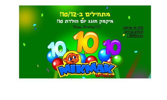 היושששששש אז מיקמק חוגג 10! כמה מילים: 1.מזל טוב! 2.שהאתר ימשיך להתקיים בשנים הבאות! 3.שימשיך להיות לנו כיף! 4.אתם עוזרים לכולם! 5.אוהבת אתכם! יש עוד מלאאא אבל אין מקום בשביל לכתוב את כולם וגם לא נדמה לי שאתם תקראו 100 דברים!