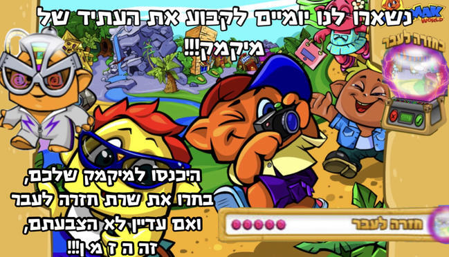 היי לכולם, רציתי לכתוב לכם את זה כבר כמה ימים ומצאתי את הזמן עכשיו. כפי שאתם כנראה יודעים יש את ההצבעה לשרת החזרה בעבר- אתם לא רוצים שהמיקמקים החדשים ידעו מה זה מיקמק של פעם? אתם לא רוצים בעצמכם לראות מה זה מיקמק של פעם? כל מה שצריך לעשות זה להיכנס להתחל לשחק ולמיקמקים שלכם- בחרו את שרת חזרה לעבר ותצביעו! זה הזמן להכיר את האתר שלנו לחברים ולמשפחה ולבקש מכל מי ששחק ומשחק להצביע- זה חשוב!!! יש לנו יומיים מהיום ואנחנו על 40,000 הצבעות- המטרה היא 70 אלף. אמנם נשאר לנו קצת זמן אבל אני מאמין שנצליח! תעשו הכל בשביל שנגיע ליד- כי בסופו של דבר, זה בשבילנו.