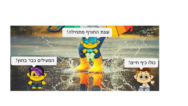 המורה:תלמידים יקרים אתם יודעים שעונת החורף כבר התחילה? התלמידים:יששששששש,סוף סוף מתחיל התגעגעתי לריח של החורף לגשם ולברד! התלמידים:אבל רגע המורה לא היה כבר חורף?,ירד גם גשם וגם ברד וגם הריח היה. המורה:לא זה לא היה חורף זה היה סתיו,סתיוזה גם גשם וגם שמש! המורה ממשיך לדבר:אני אלמד אתכם עוד מעט! תלמידים:טוב!