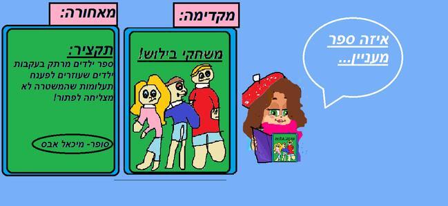 אז היי מויטקימוס היום עשיתי יצירה לבלוג הפרס אני ציירתי את הכריכה של הספר האהוב עלי משחקי בילוש ואני חייבת ללכת אז ביוש אוהבת!